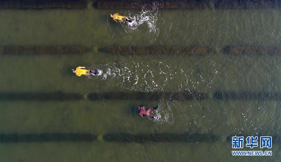 10月22日,樂亭縣姜各莊鎮(zhèn)二節(jié)村海參養(yǎng)殖基地的工人在捕撈海參(無人機(jī)拍攝)。 時(shí)下,正值渤海灣地區(qū)海參收獲時(shí)節(jié),河北省樂亭縣的海參養(yǎng)殖戶忙著捕撈海參,供應(yīng)各地市場。據(jù)介紹,該縣海域水質(zhì)優(yōu)良、氣候適宜,是海參養(yǎng)殖的理想場地,目前發(fā)展池塘造礁養(yǎng)殖海參面積6萬畝,年產(chǎn)鮮活海參6000多噸,年產(chǎn)值2億多元。 新華社記者 楊世堯 攝