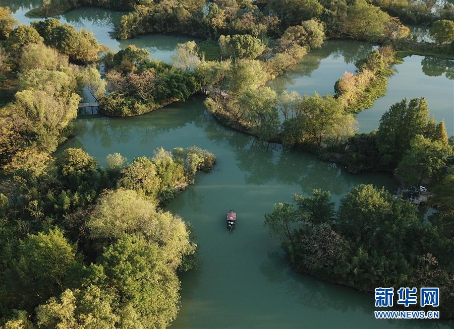 10月29日,游船行駛在西溪濕地河道上(無人機拍攝)。 新華社記者翁忻旸攝