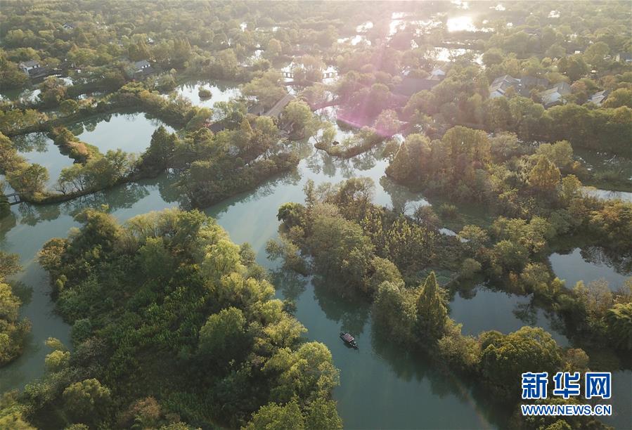 10月29日,游船行駛在西溪濕地河道上(無(wú)人機(jī)拍攝)。新華社記者翁忻旸攝