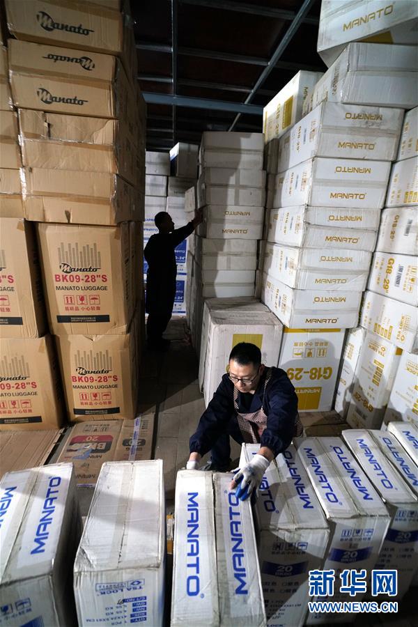 11月3日,貴溪市美納途箱包公司的工作人員在為“雙十一”購(gòu)物節(jié)備貨。