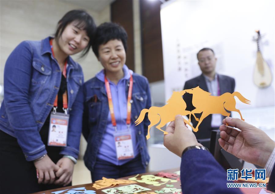 11月4日,在首屆中國(guó)國(guó)際進(jìn)口博覽會(huì)新聞中心,媒體記者觀看中國(guó)傳統(tǒng)剪紙技藝展示。 新華社記者蘭紅光攝