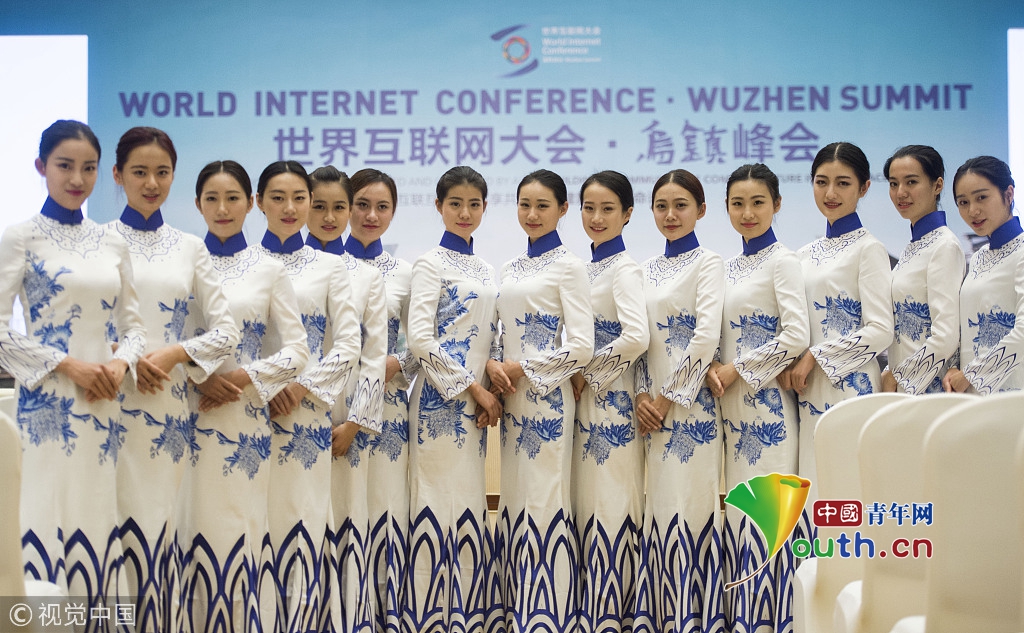 2016年11月16日,浙江烏鎮(zhèn),第三屆世界互聯(lián)網(wǎng)大會首日,身著群青鸞鳳刺繡旗袍的大學(xué)生禮儀賣萌自拍,成為會議間隙的一道風(fēng)景。