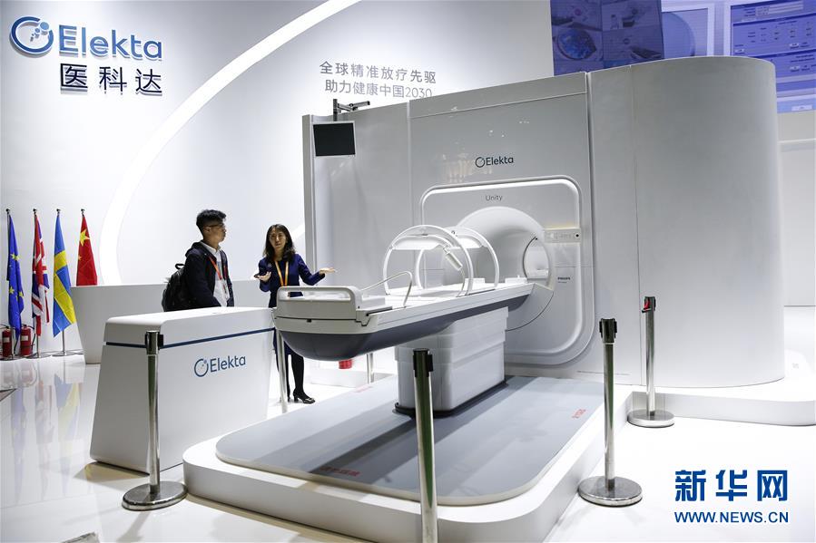 11月6日,瑞典醫(yī)科達(dá)公司工作人員為一名記者介紹高場(chǎng)強(qiáng)磁共振放療系統(tǒng)Elekta Unity。該款診斷級(jí)磁共振成像系統(tǒng)與先進(jìn)的放療加速器有機(jī)結(jié)合,可以在腫瘤放療治療的過(guò)程中實(shí)時(shí)、高分辨率地顯示和追蹤腫瘤的變化。 新華社記者 張玉薇 攝
