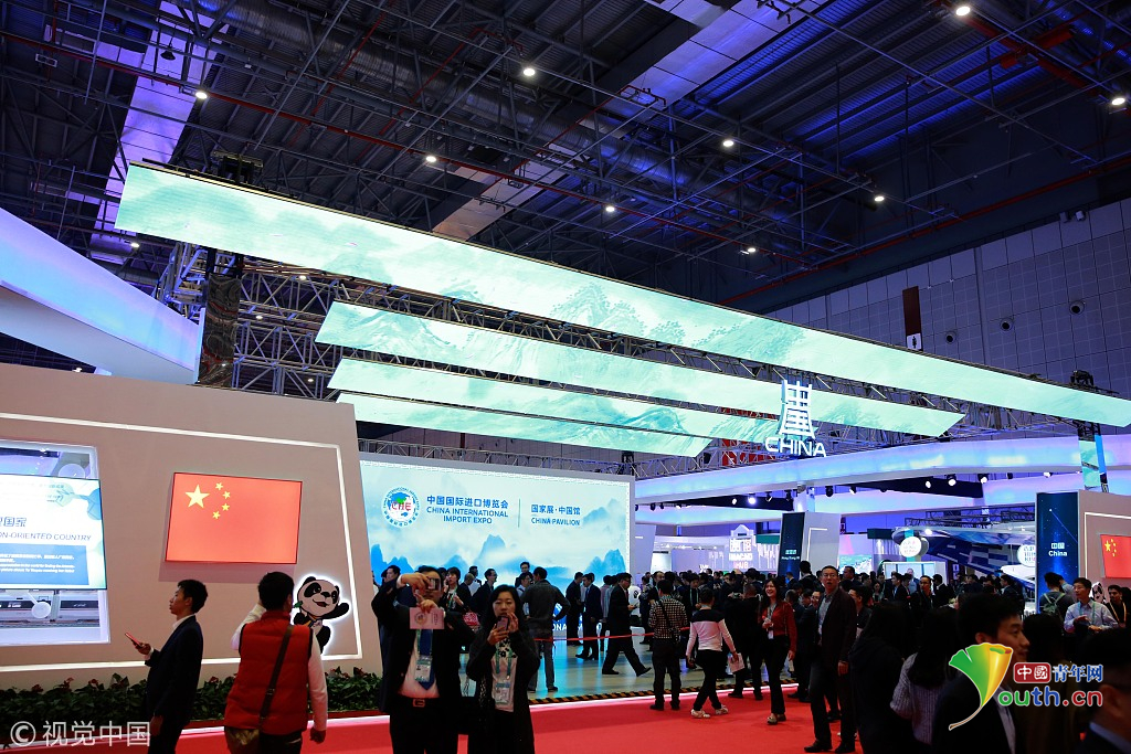 2018年11月6日,上海,首屆中國(guó)國(guó)際進(jìn)口博覽會(huì)國(guó)家展上,共有82個(gè)國(guó)家、3個(gè)國(guó)際組織設(shè)立了71個(gè)展臺(tái)。中國(guó)館。視覺(jué)中國(guó)