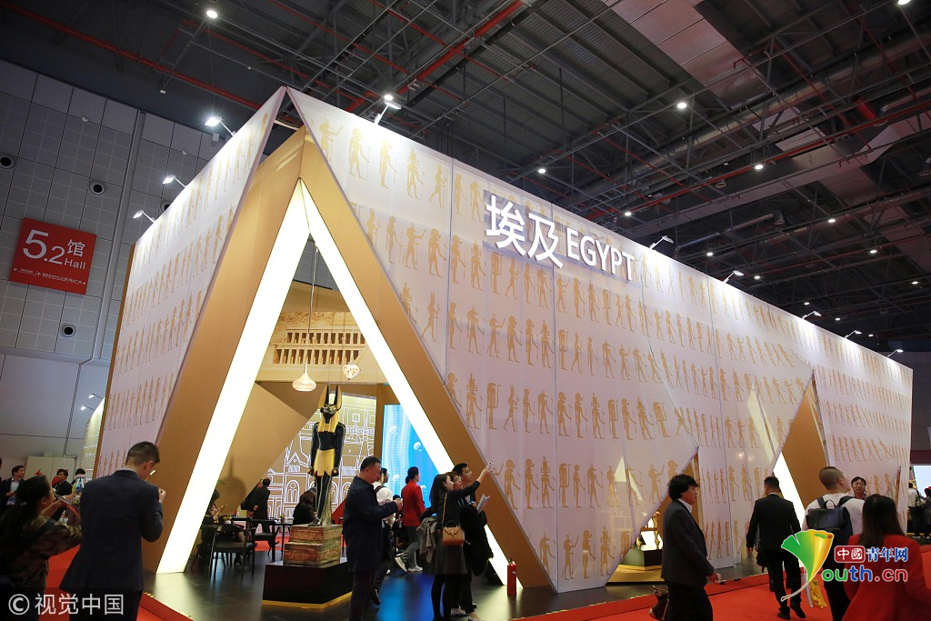 2018年11月6日,上海,首屆中國(guó)國(guó)際進(jìn)口博覽會(huì)國(guó)家展上,共有82個(gè)國(guó)家、3個(gè)國(guó)際組織設(shè)立了71個(gè)展臺(tái)。埃及館。視覺(jué)中國(guó)