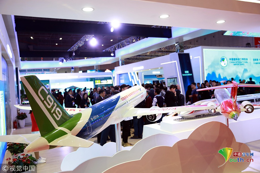 2018年11月6日,上海,首屆中國(guó)國(guó)際進(jìn)口博覽會(huì)國(guó)家展上,共有82個(gè)國(guó)家、3個(gè)國(guó)際組織設(shè)立了71個(gè)展臺(tái)。中國(guó)館展示的C919飛機(jī)。視覺(jué)中國(guó)