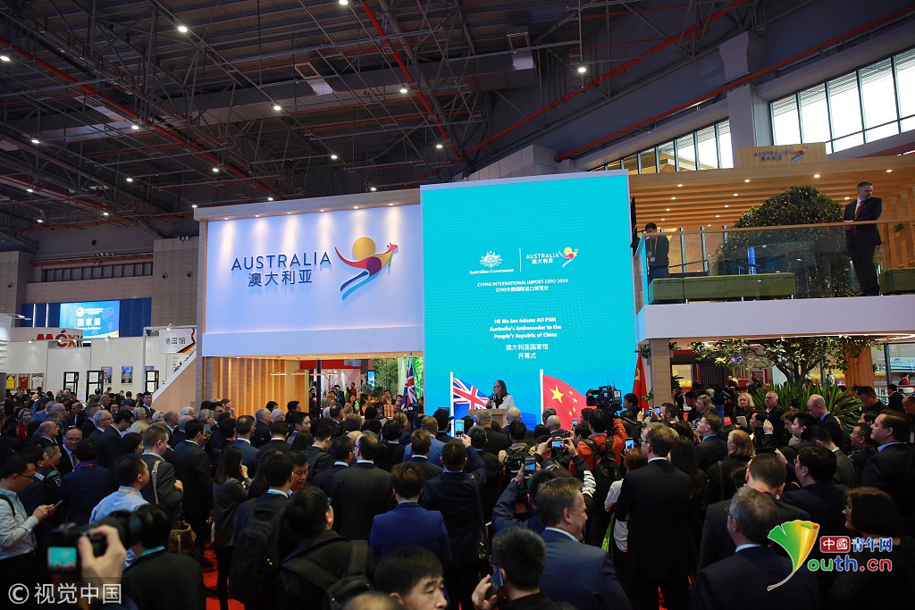2018年11月6日,上海,首屆中國(guó)國(guó)際進(jìn)口博覽會(huì)國(guó)家展上,共有82個(gè)國(guó)家、3個(gè)國(guó)際組織設(shè)立了71個(gè)展臺(tái)。澳大利亞館新產(chǎn)品、新技術(shù)發(fā)布。視覺(jué)中國(guó)