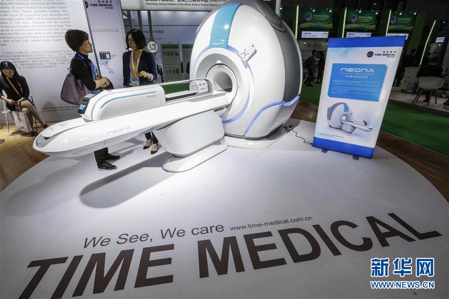 11月6日,觀眾在美國(guó)通用電氣公司展臺(tái)參觀CT機(jī)。新華社記者 丁汀 攝