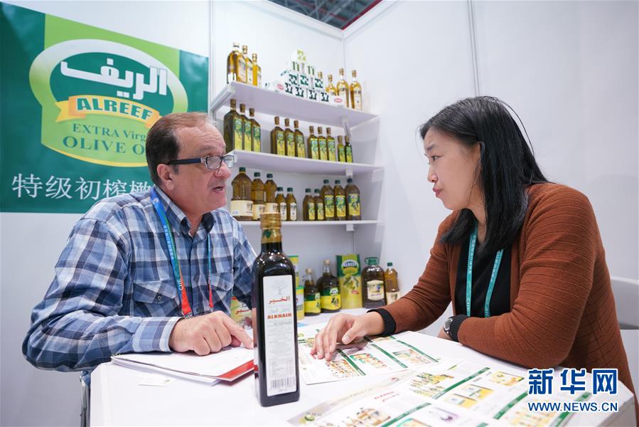 11月6日,敘利亞橄欖油經(jīng)銷商胡薩姆(左)介紹橄欖油產(chǎn)品。  新華社記者 孟鼎博 攝