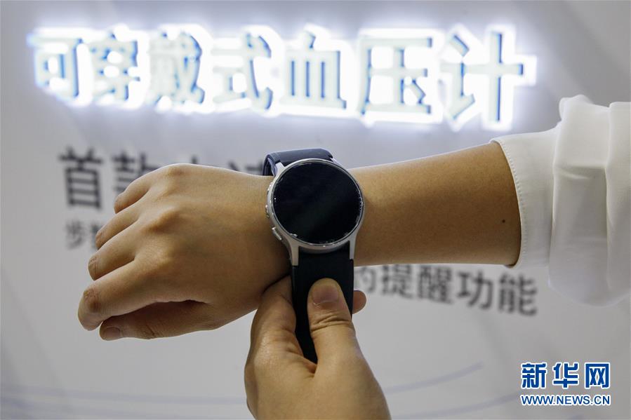 11月6日,日本歐姆龍公司工作人員在展示厚度僅25毫米的可穿戴式血壓計(jì)。  新華社記者 張玉薇 攝