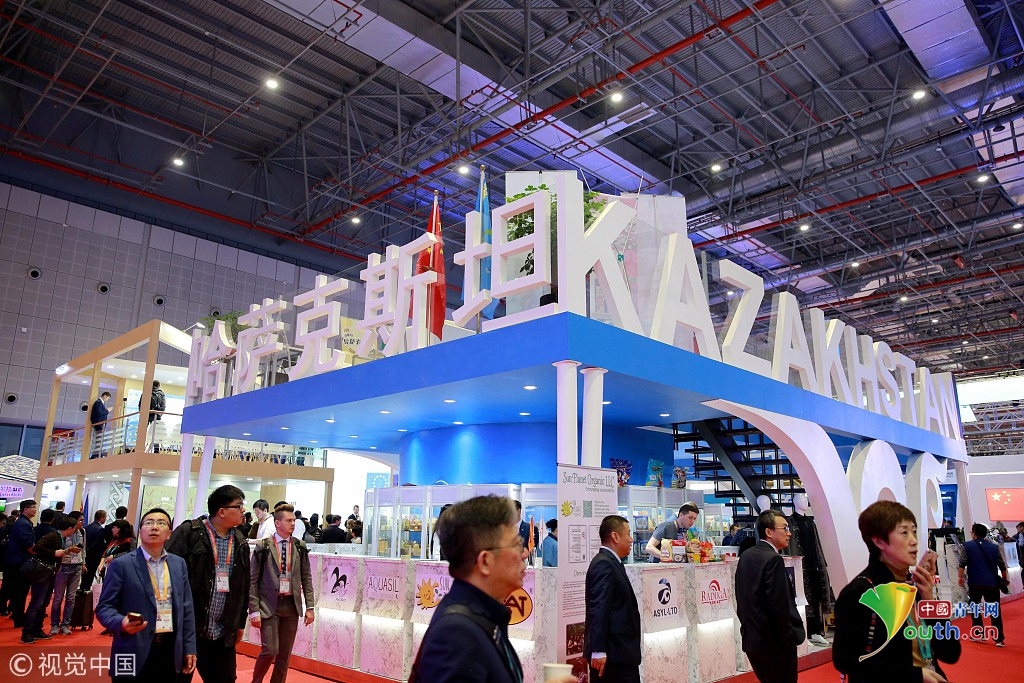 2018年11月6日,上海,首屆中國(guó)國(guó)際進(jìn)口博覽會(huì)國(guó)家展上,共有82個(gè)國(guó)家、3個(gè)國(guó)際組織設(shè)立了71個(gè)展臺(tái)。哈薩克斯坦館。視覺(jué)中國(guó)