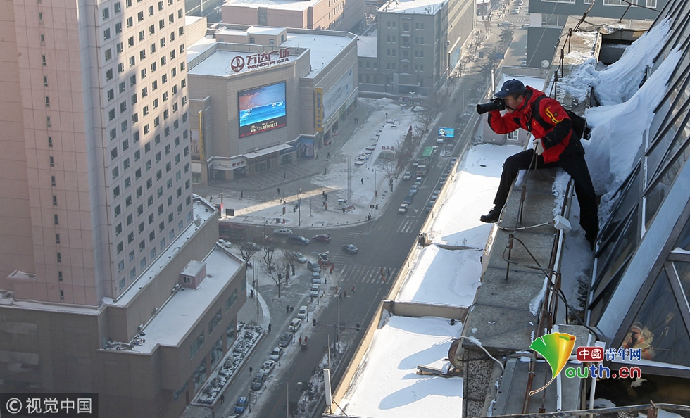 2012年12月4日,為了一個(gè)好的角度,郭銳經(jīng)常爬上長(zhǎng)春的各種高樓。 圖片作者:白石/視覺(jué)中國(guó)