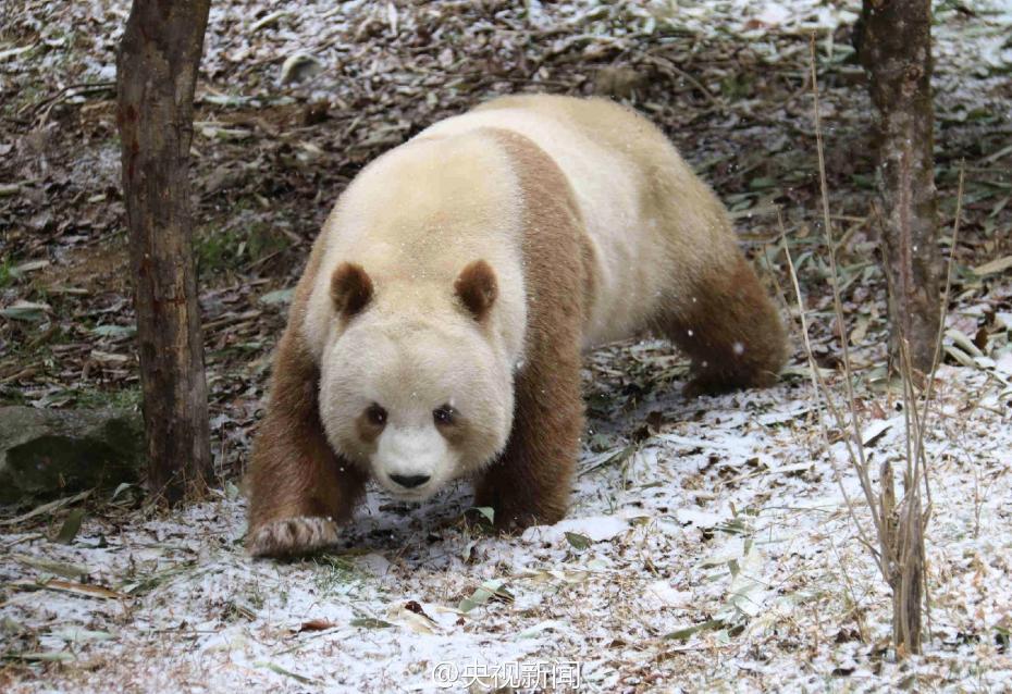 秦嶺大熊貓野化培訓(xùn)佛坪基地,7歲的棕色大熊貓七仔是目前全世界唯一能看到的棕色大熊貓活體。今年是它在基地過的第二個(gè)冬天,每逢下雪,七仔就興奮地滿園子跑,變身“雪花熊”。圖片來源:央視新聞官方微博