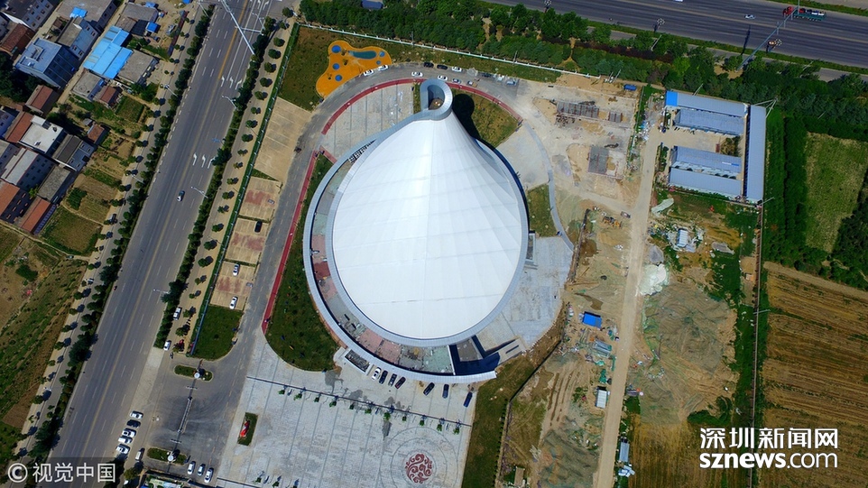 2018年6月13日,航拍河南淮陽一座即將竣工落成的體育場館建筑,市民稱酷似一個石磨盤。