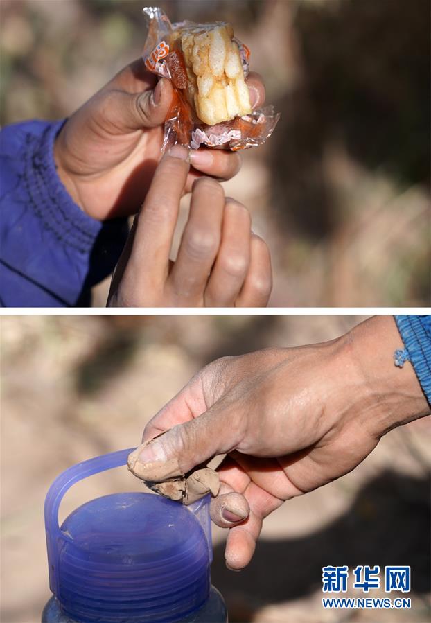 拼版照片:上圖為陳喜波的妻子王登興在棉田里用簡單的食品作午餐;下圖為陳喜波在午餐時準(zhǔn)備喝水(10月23日攝)。