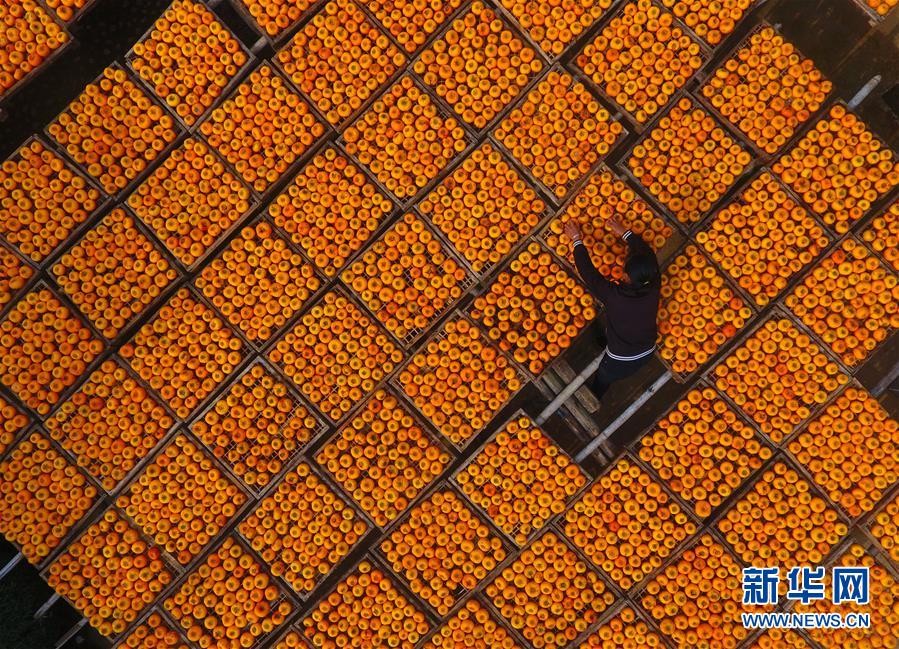 10月17日,廣西桂林市平樂縣沙子鎮(zhèn)渡河村農(nóng)民在晾曬柿子(手機拍攝)。 金秋時節(jié),農(nóng)民們忙著收獲成熟的農(nóng)作物,喜迎豐收。 新華社記者 黃孝邦 攝