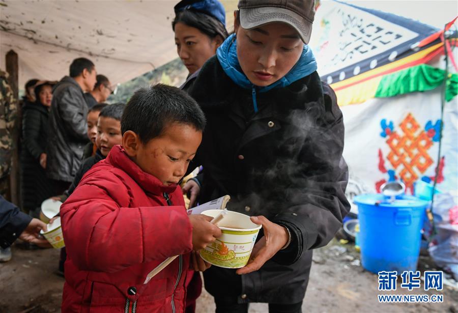 波羅鄉(xiāng)工作人員在臨時過渡安置點內(nèi)為波羅鄉(xiāng)第一小學學生盛晚飯(10月14日攝)。 新華社記者 劉東君 攝