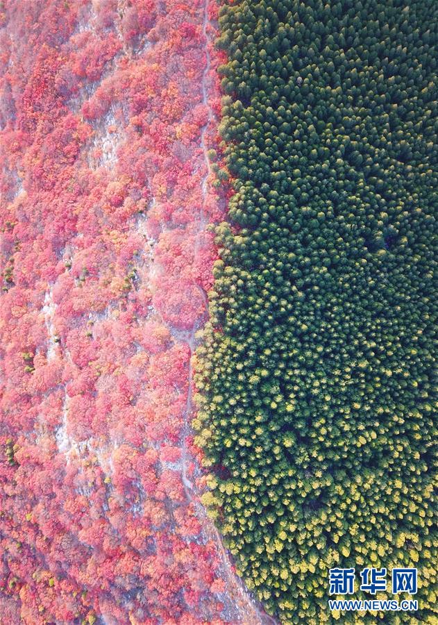 這是山東濟(jì)南楔子山色彩分明的樹林(10月31日無人機(jī)拍攝)。 新華社記者朱崢攝