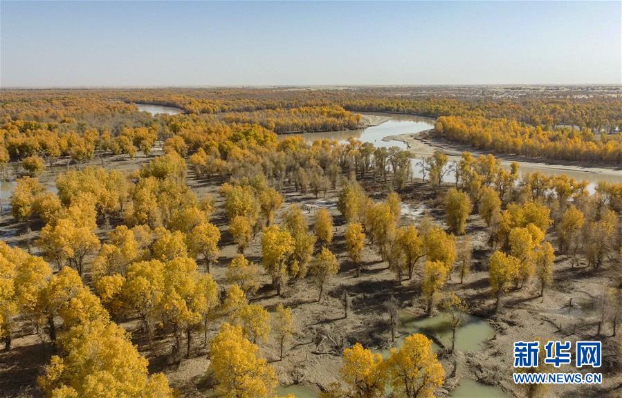這是從空中俯瞰新疆巴音郭楞蒙古自治州尉犁縣的金色胡楊(10月25日無(wú)人機(jī)拍攝)。 新華社記者 趙戈 攝
