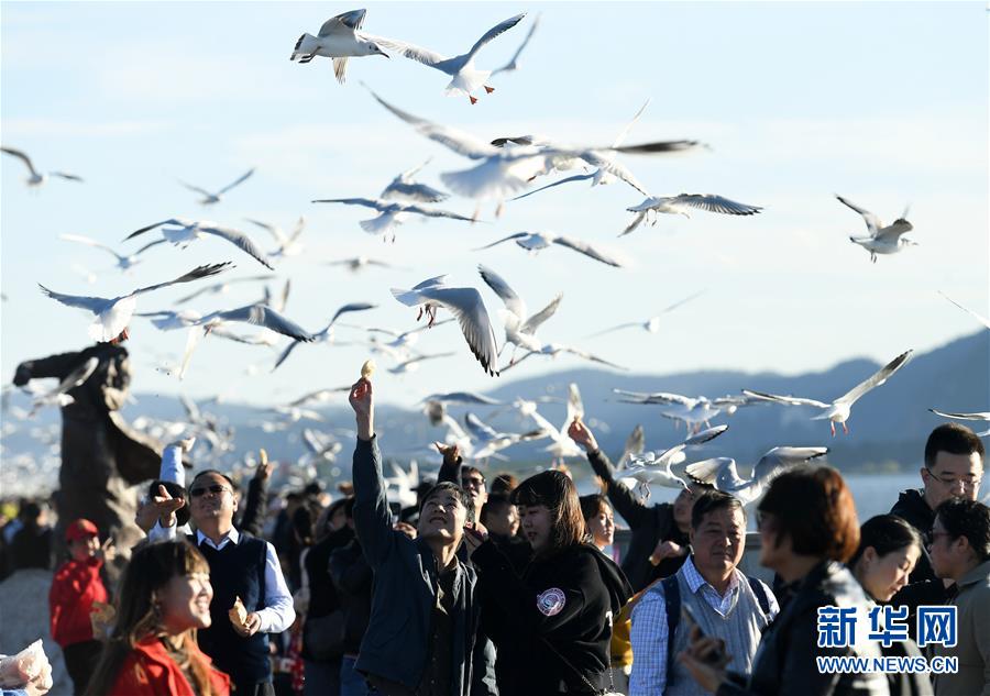 11月14日,人們?cè)诶ッ鞯岢剡呌^賞紅嘴鷗?! ⌒氯A社記者 藺以光 攝