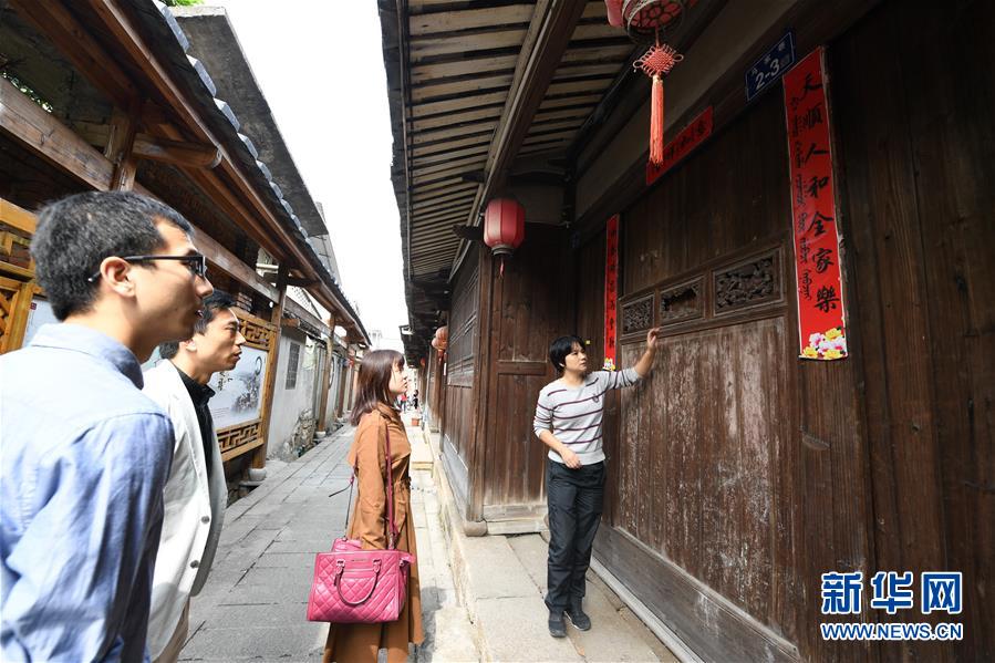 10月27日,琴江滿(mǎn)族村游客服務(wù)中心的鄭閩瓊(右一)向游客介紹三江口清朝水師旗營(yíng)古兵房建筑特色。福州市長(zhǎng)樂(lè)區(qū)琴江滿(mǎn)族村是福建省唯一的滿(mǎn)族聚居村,也是我國(guó)東南沿海保存較為完整的清代水師城堡。清雍正六年(1728年)時(shí),清政府在此建立“福州三江口水師旗營(yíng)”,鎮(zhèn)守閩江口,拱衛(wèi)省城,緝捕海盜,打擊走私。這里成為當(dāng)時(shí)全國(guó)四大水師旗營(yíng)之一,隨后逐漸成為一個(gè)居民小鎮(zhèn)。有近300年歷史的琴江村既有軍事歷史背景,又有民族文化特色,2010年成為“中國(guó)歷史文化名村”。新華社記者 林善傳 攝