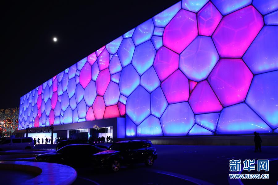 11月20日,在北京舉行的世界兒童日主題活動上,國家游泳中心外墻被點(diǎn)亮。 新華社記者張玉薇攝
