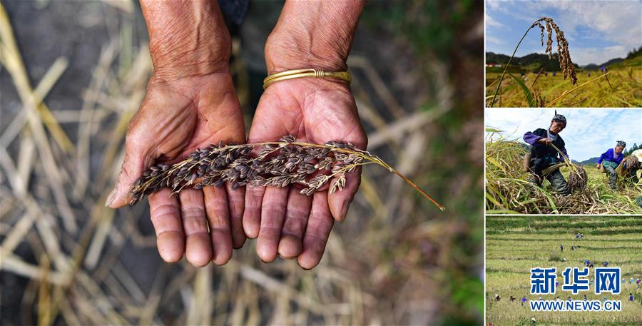 拼版照片:左圖為在安太鄉(xiāng)元寶村,80歲的賈榮專手捧剛剛收獲的香糯;右上圖為成熟待收的香糯;右中圖為賈榮專(左)在收割香糯;右下圖為村民們?cè)谑障闩矗ㄕ掌鶖z于10月30日)。2017年,賈榮專加入村里的香糯種植合作社。香糯是廣西融水大苗山的特產(chǎn),它生長(zhǎng)在高寒高海拔的特殊自然環(huán)境中,產(chǎn)量少,營(yíng)養(yǎng)價(jià)值高。 廣西融水苗族自治縣是國家扶貧工作重點(diǎn)縣,全縣“九山半水半分田”,生活生產(chǎn)環(huán)境較為惡劣,脫貧攻堅(jiān)任務(wù)艱巨,目前還有7.68萬貧困人口。面對(duì)經(jīng)濟(jì)發(fā)展落后、貧困面廣且程度深的現(xiàn)狀,當(dāng)?shù)匕衙撠毠?jiān)與創(chuàng)新產(chǎn)業(yè)扶持相結(jié)合,依托生態(tài)資源優(yōu)勢(shì),實(shí)施“特色產(chǎn)業(yè)富民行動(dòng)”,通過發(fā)展特色民族旅游、林下經(jīng)濟(jì)和特色養(yǎng)殖業(yè)等扶貧產(chǎn)業(yè),帶動(dòng)貧困群眾依靠勤勞的雙手,拔窮根摘窮帽,實(shí)現(xiàn)脫貧致富。據(jù)了解,目前全縣貧困戶參與特色產(chǎn)業(yè)發(fā)展的有2.9萬戶,扶貧產(chǎn)業(yè)覆蓋率達(dá)95%。 新華社記者 黃孝邦 攝