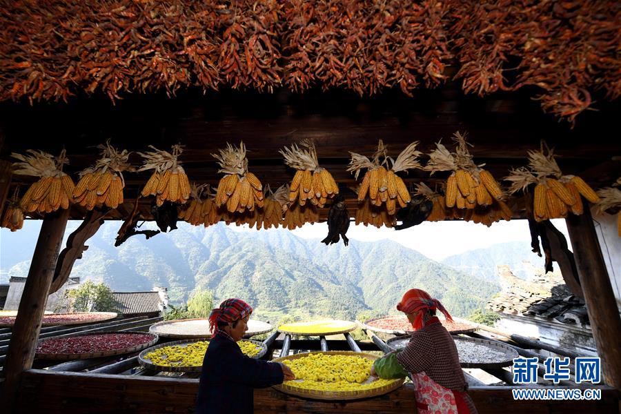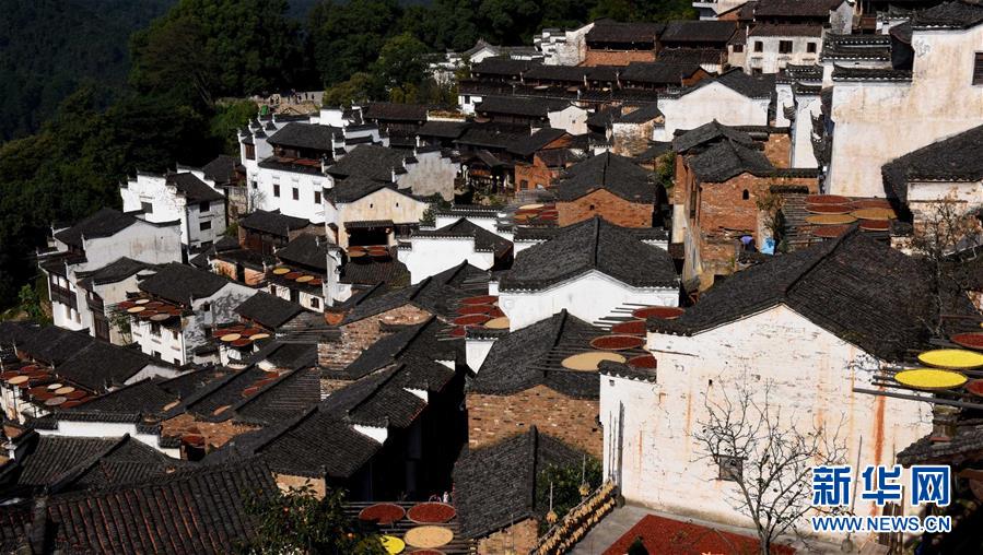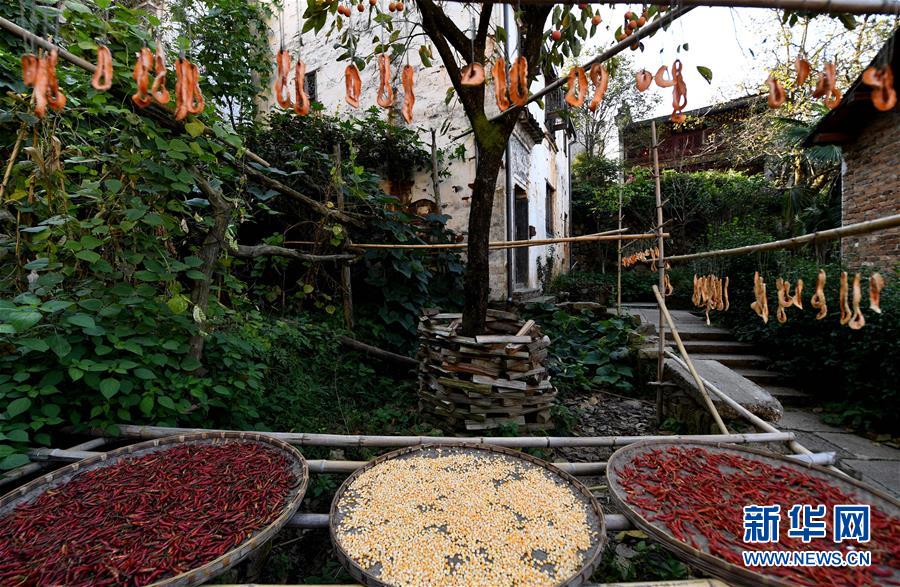 2017年10月26日拍攝的篁嶺古村。家家戶戶晾曬各種蔬果及皇菊。近日天氣晴朗,江西省婺源縣江灣鎮(zhèn)篁嶺村村民抓住時(shí)機(jī)采摘、晾曬皇菊及蔬果。明黃的菊花、火紅的辣椒……各種顏色將篁嶺古村裝扮成巨大的“調(diào)色板”,引來(lái)眾多游客感受鄉(xiāng)村美景。新華社記者宋振平 攝