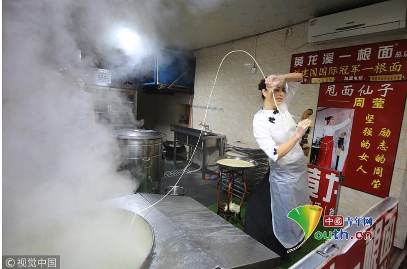 2018年11月19日,成都,繼“妖嬈拉面哥”之后,黃龍溪古鎮(zhèn)一個(gè)身材高挑的古裝美女,一邊跳舞一邊揮甩著手中的面條被贊“甩面仙子”走紅網(wǎng)絡(luò)。圖片作者:紅葉/視覺(jué)中國(guó)
