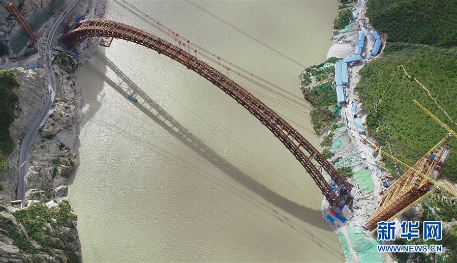 9月28日無人機拍攝的川藏鐵路拉林段重點標志性工程藏木特大橋。 當日,隨著最后一節(jié)鋼管拱的對位和鎖定完畢,川藏鐵路拉林段藏木特大橋成功合龍,標志著大橋主體結構施工取得了關鍵性勝利。藏木特大橋由中國中鐵廣州局集團承建,拱高112米,橋橫跨雅魯藏布江峽谷,水深66米。 新華社記者普布扎西攝