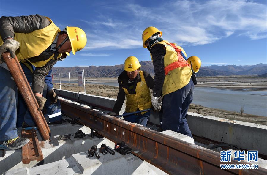 中鐵十一局的工人在川藏鐵路拉林段昌果特大橋進(jìn)行鋪軌作業(yè)(10月16日攝)。 近日,川藏鐵路拉薩至林芝段昌果特大橋開(kāi)始鋪設(shè)行軌排、架設(shè)梁片,標(biāo)志著川藏鐵路拉林段正式進(jìn)入鋪軌階段。 新華社記者 覺(jué)果 攝