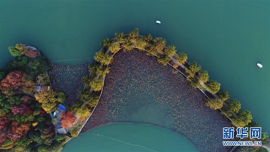 兩只小船行駛在湖南烈士公園年嘉湖湖面(11月25日無人機拍攝)。新華社記者 李尕攝