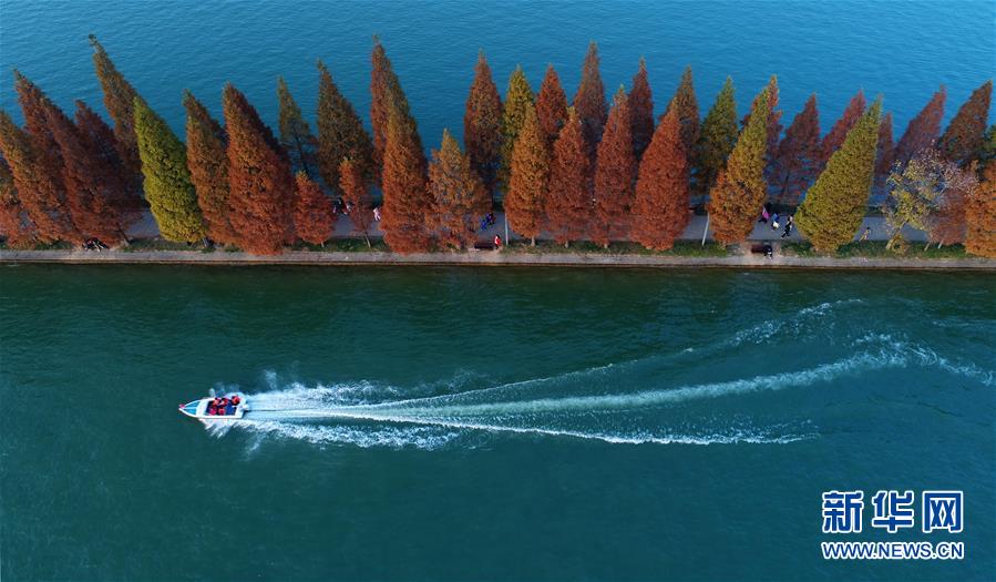 一艘游艇在湖南烈士公園年嘉湖湖面行駛(11月25日無(wú)人機(jī)拍攝)。新華社記者 李尕?cái)z