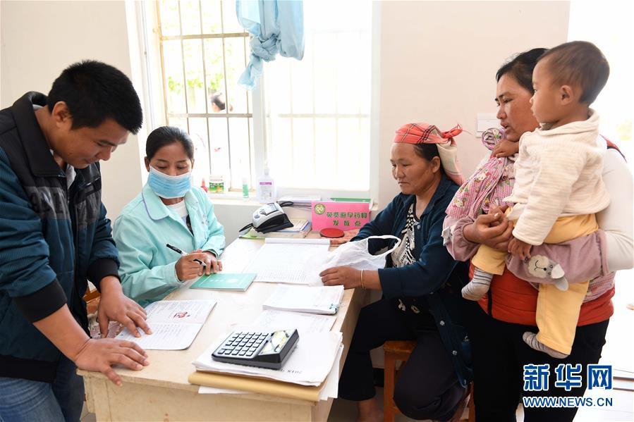 11月28日,張惠仙(左二)在巖因村衛(wèi)生室接待前來(lái)看病的村民。 新華社記者 楊宗友 攝