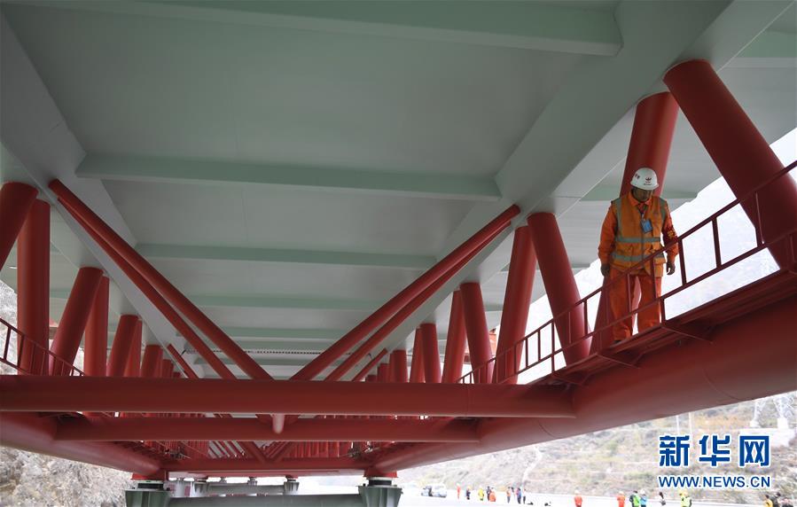 11月3日,安全管理員在克枯大橋上檢查。 當(dāng)日,位于四川省阿壩藏族羌族自治州的汶(川)馬(爾康)高速的控制性工程克枯大橋合龍。 新華社記者 劉坤 攝