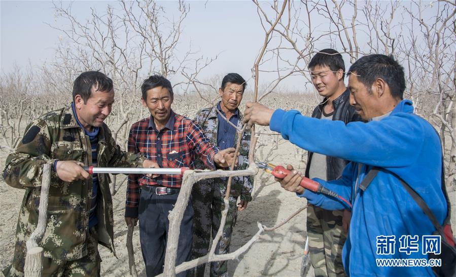 在拜什托格拉克鄉(xiāng)依提帕克吾斯唐村的棗地里,當(dāng)?shù)卮迕駥W(xué)習(xí)修剪棗樹(shù)枝條(3月19日攝)。 新華社發(fā)