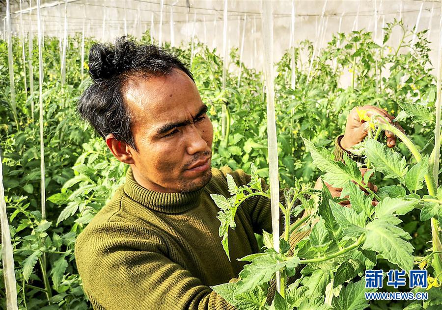 拜什托格拉克鄉(xiāng)和融新村村民艾力·吾吉艾合麥提在大棚里查看番茄的生長(zhǎng)情況(11月29日攝)。 新華社記者 白志強(qiáng) 攝