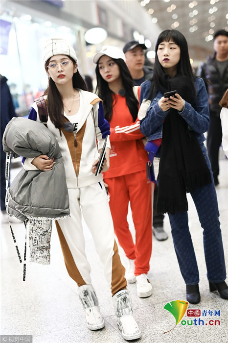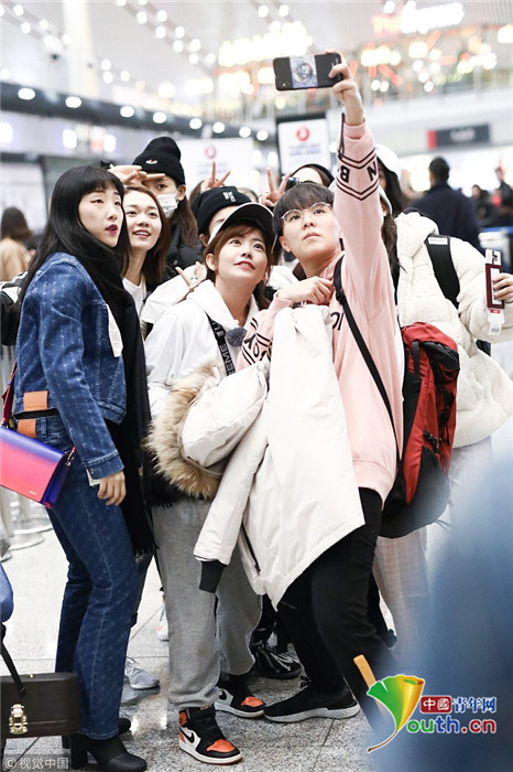 2018年12月3日,北京,“火箭少女101”全體成員現(xiàn)身機(jī)場前往國外錄制團(tuán)總綜。其中孟美岐戴著墨鏡,一身全黑運(yùn)動裝扮,大步流星氣場超強(qiáng),楊蕓晴、yamy、楊超越等成員緊隨其后,大家還一起在機(jī)場玩起自拍,好不歡樂。