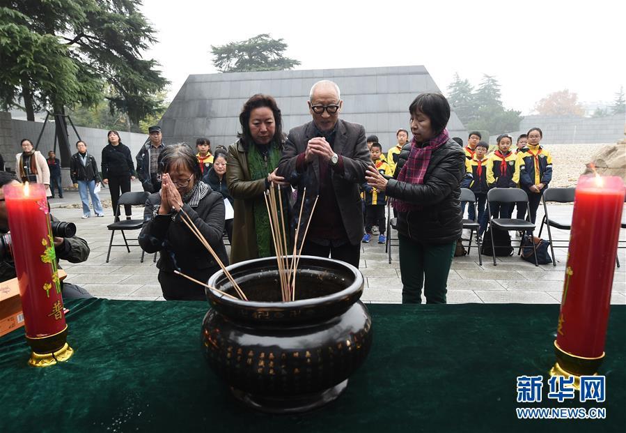 12月3日,南京大屠殺幸存者余昌祥(前排右二)率家屬祭拜被侵華日軍殺害的親人。 當日,在第五個南京大屠殺死難者國家公祭日到來之際,南京大屠殺死難者遺屬家祭活動在侵華日軍南京大屠殺遇難同胞紀念館正式啟動。首批前來開展家祭活動的南京大屠殺幸存者余昌祥、石秀英老人分別率家屬在紀念館內(nèi)的死難者名單墻前獻花、敬香、跪拜,并誦讀家信,表達對親人的哀思。 新華社記者 孫參 攝