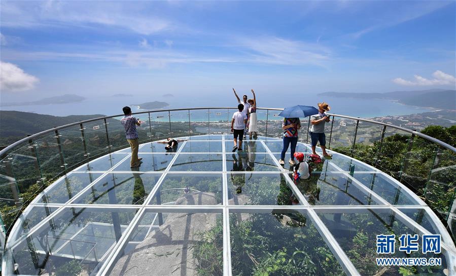 8月31日,游客在玻璃觀景平臺(tái)上參觀游覽。近日,位于海南省三亞市亞龍灣熱帶天堂森林公園的大佛石全海景玻璃棧道開(kāi)始正式營(yíng)業(yè)。凌空而建的玻璃棧道全長(zhǎng)400米,游客可將亞龍灣的美景盡收眼底。新華社記者郭程攝