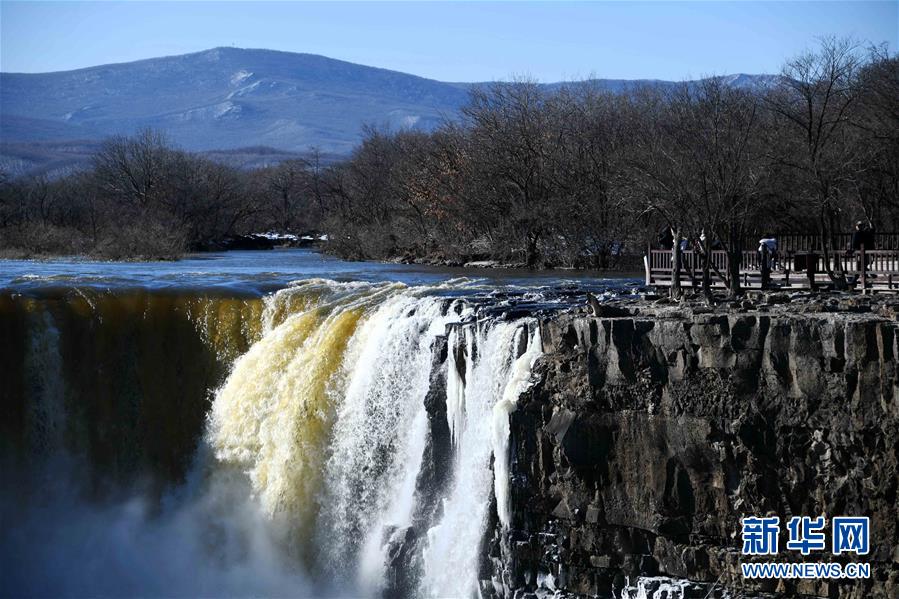 12月5日,游客在觀(guān)賞吊水樓瀑布。 受上游來(lái)水量大和近期氣溫偏高等因素影響,位于黑龍江東南部的火山堰塞湖——鏡泊湖的吊水樓瀑布水量充沛,展現(xiàn)出飛流直下、水霧升騰的冬季奇觀(guān),引來(lái)許多游人觀(guān)賞。 新華社記者王建威攝