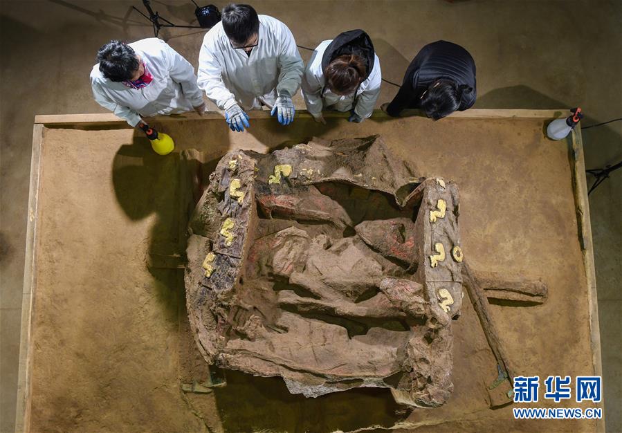在位于河北行唐的考古實驗室內,外表裝飾奢華的車廂(俯視)展露“真容”(12月4日攝)。新華社記者 李賀 攝