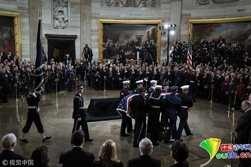 美國(guó)前總統(tǒng)老布什的遺體3日下午運(yùn)抵首都華盛頓,安放在國(guó)會(huì)大廈圓頂大廳,接受吊唁。