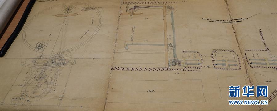這是11月2日在英國紐卡斯?fàn)柕奶┒鳌枡n案館拍攝的致遠(yuǎn)艦設(shè)計(jì)圖紙。 新華社記者日前在紐卡斯?fàn)柼┒鳌枡n案館查找北洋海軍史料時(shí)發(fā)現(xiàn)一套七張、檔案名為“中國巡洋艦舵機(jī)設(shè)計(jì)圖”的原始圖紙。塵封百年,甲午海戰(zhàn)中抗擊日艦后沉沒的清北洋海軍致遠(yuǎn)艦部分原廠設(shè)計(jì)圖紙?jiān)谄浣ㄔ斓亍~卡斯?fàn)柺械囊患覚n案館首次被發(fā)現(xiàn),為打撈那段悲壯的歷史提供了重要參考。 新華社記者 韓巖 攝