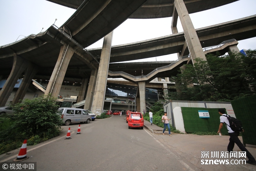 2018年5月29日,重慶,魔幻重慶又雙叒叕放大招!還有一個獨特的亮點,重慶軌道交通3號線銅元局站,出口由一段長梯銜接上方立交橋和下方的路面,與全國最高城市立交橋蘇家壩立交組成了獨特風景,許多游客專門趕來拍照。