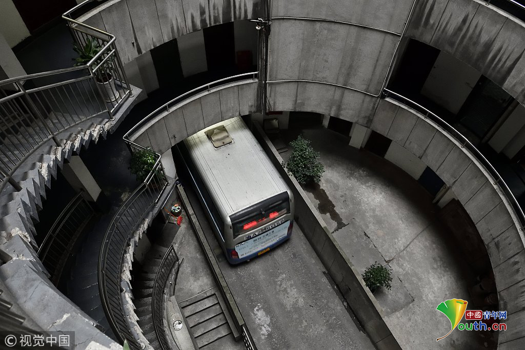 探秘重慶魔幻八層圓筒型轉(zhuǎn)轉(zhuǎn)樓 公交車穿其而過