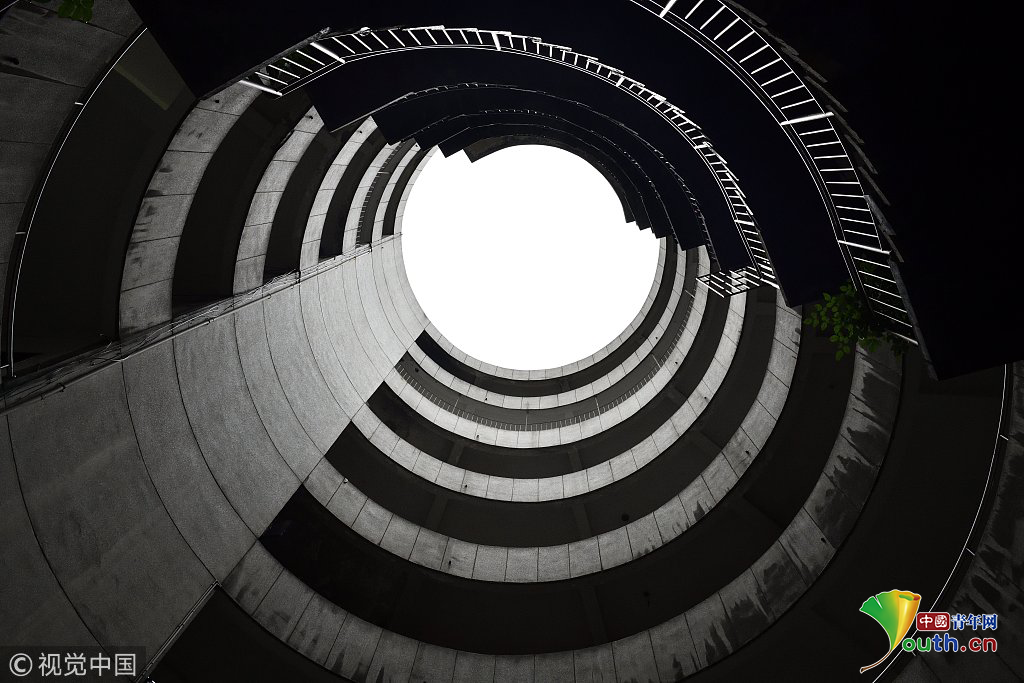 2017年9月27日,重慶,南岸區(qū)某小區(qū)的“螺旋”停車場(chǎng),從公路到車庫(kù)要下5層樓,司機(jī)需要轉(zhuǎn)無數(shù)個(gè)360度圈。圖片來源:視覺中國(guó)