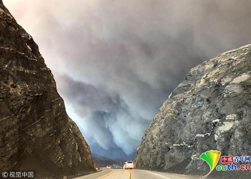 該郡第二大城市千橡樹市(Thousand Oaks)等很多地方房屋被毀,高速公路封閉,居民緊急疏散。洛杉磯郡圣蓋博市(San Gabriel)警察局警官日瓦戈(O. Zhivaga)和同事們當(dāng)天清晨即受命馳援文圖拉郡,保護(hù)當(dāng)?shù)鼐用窈拓?cái)產(chǎn)安全。圖為消防車行駛在已封閉的公路上,天空中濃煙滾滾。