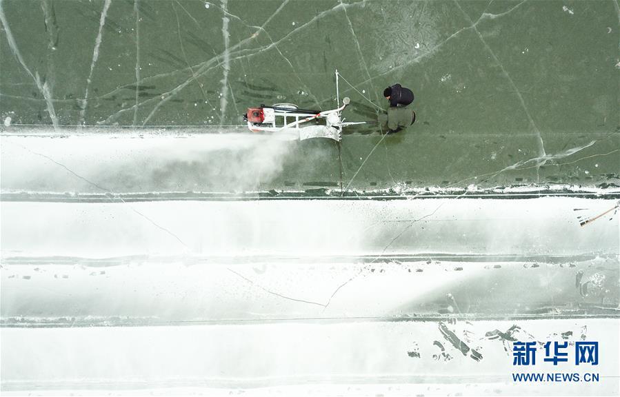 在松花江哈爾濱段江面,工人們在進行切割和采冰工作(12月12日無人機拍攝)。 黑龍江哈爾濱市的冰雪主題樂園哈爾濱冰雪大世界的采冰和建設工作近日拉開帷幕。為保證足夠的優(yōu)質冰供給,每天有近千名采冰人和700多輛運冰車參與到采冰工作。 新華社記者 王松 攝