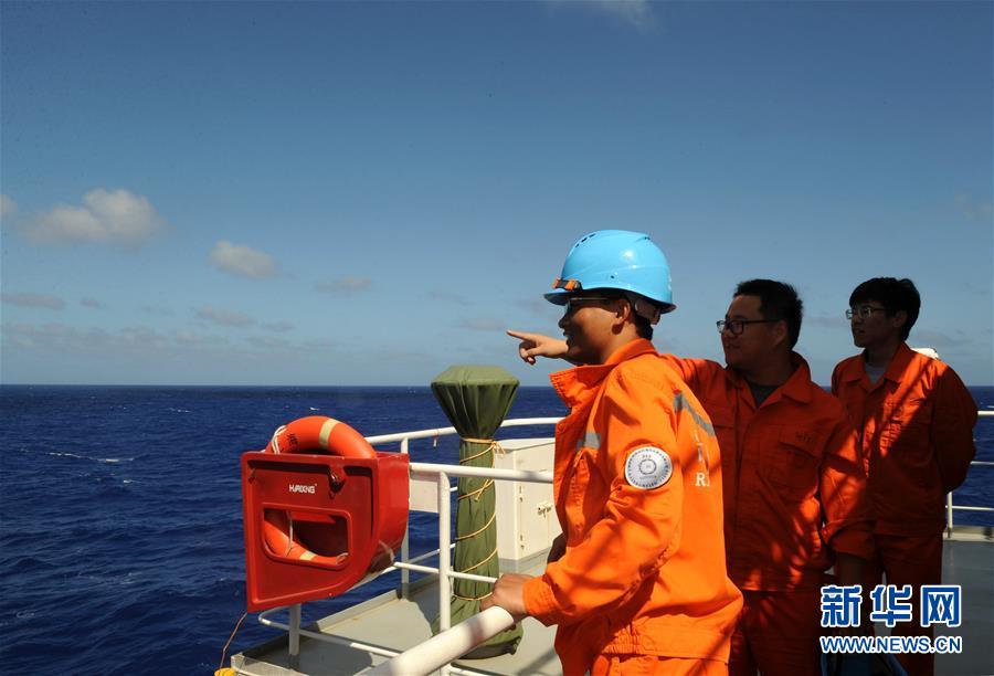 “彩虹魚”科考團隊隊員搜尋浮出海面的著陸器(12月15日攝)。
